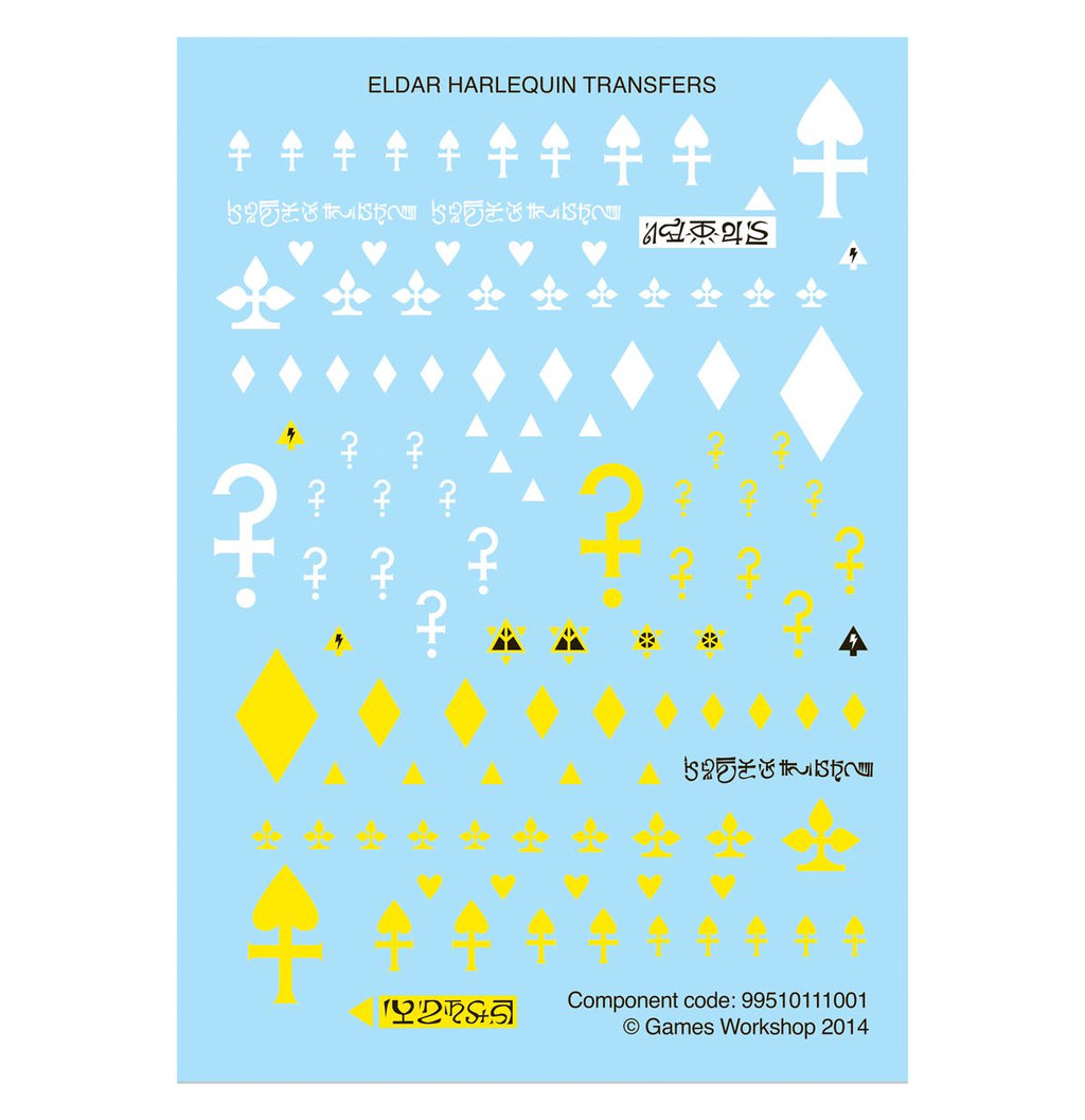 Este kit incluye dos láminas de calcomanías Harlequin, cada una con 115 calcomanías al agua de alta calidad. Estas incluyen iconos para las máscaras de La Tristeza de Medianoche, Las Estrellas Heladas, El Rencor Ascendente y La Sombra Soñadora.