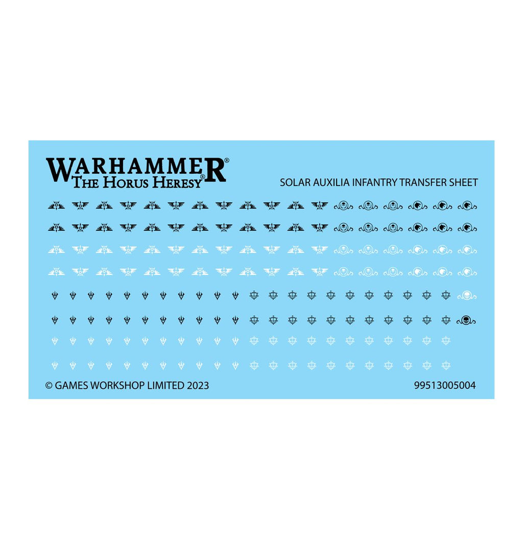 Este kit incluye 790 piezas de plástico, 2 peanas redondas Citadel de 60 mm, 25 peanas redondas Citadel de 25 mm, 2 hojas de calcomanías de infantería Solar Auxilia (152 calcomanías al agua de alta calidad cada una) y 2 hojas de calcomanías de vehículos Solar Auxilia (180 calcomanías al agua de alta calidad cada una) para personalizar tus miniaturas.