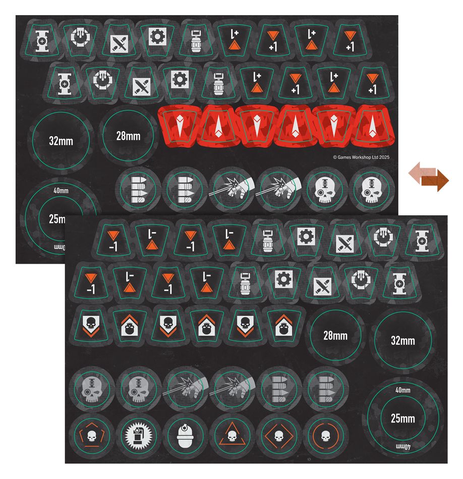 Dentro de la caja, también encontrarás una hoja con 39 fichas de los Guardianes de la Muerte de doble cara, para que puedas controlar fácilmente tu arsenal de armas y los efectos del juego en el fragor de la batalla.