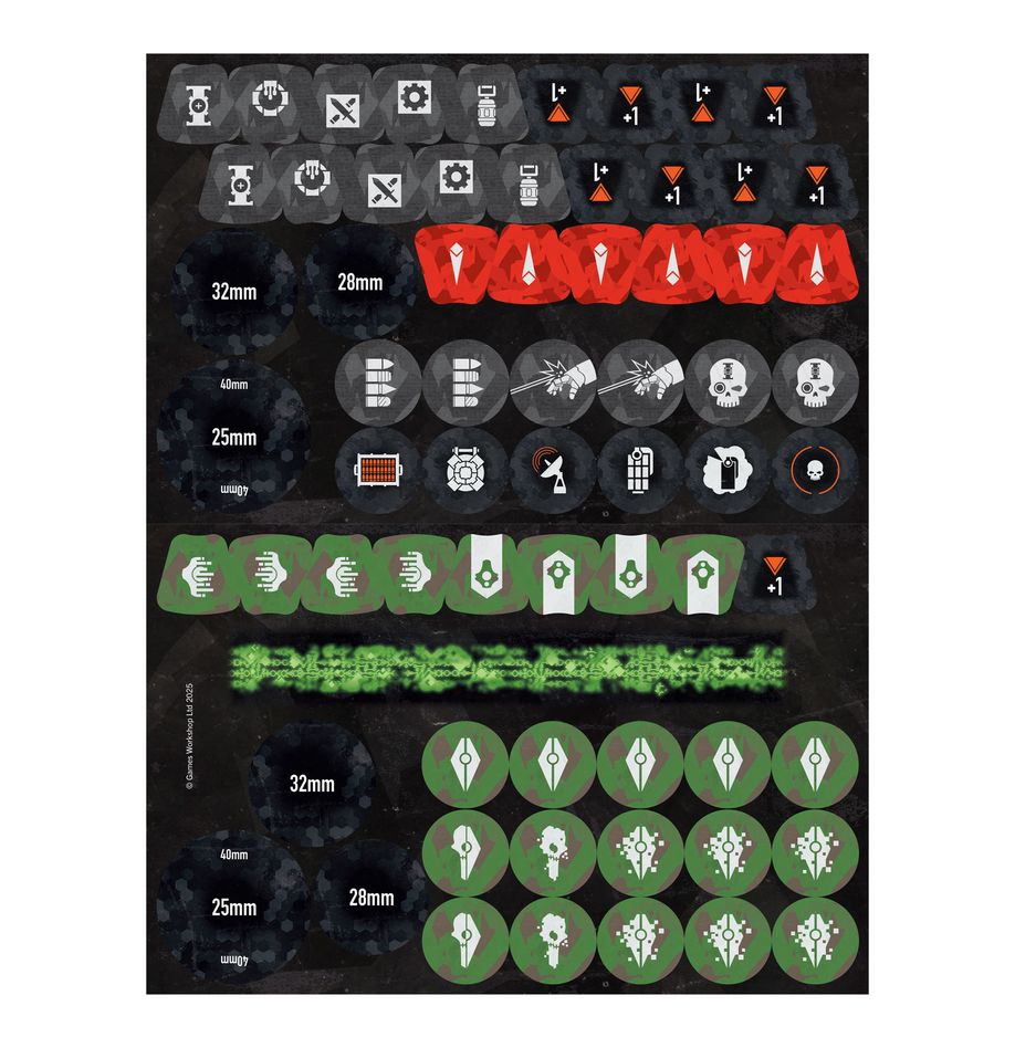Hoja de Fichas Combinadas: Registra fácilmente habilidades, objetivos, equipo y puntos durante tus partidas con fichas temáticas de equipo. La hoja contiene 67 fichas de cartón de doble cara: 39 para el equipo de eliminación Deathwatch y 28 para el equipo de eliminación Canoptek Circle.