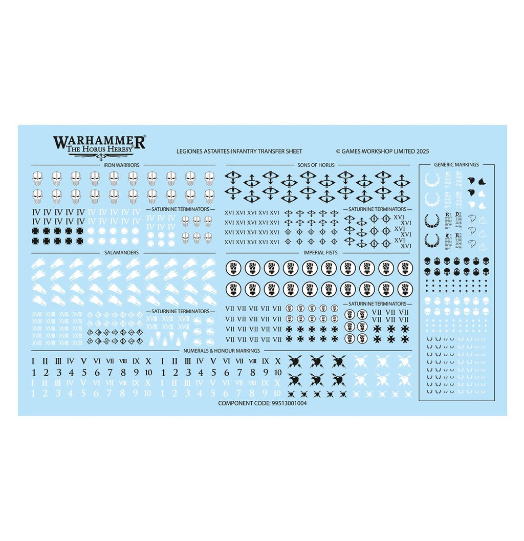 Este kit incluye una Hoja de Calcomanías de la Herejía de Horus, que contiene 618 calcomanías al agua de alta calidad para decorar tus miniaturas. Incluye iconografía de la Legión para los Hijos de Horus, los Puños Imperiales, los Guerreros de Hierro y las Salamandras, además de iconos genéricos, numerales y marcas de honor.