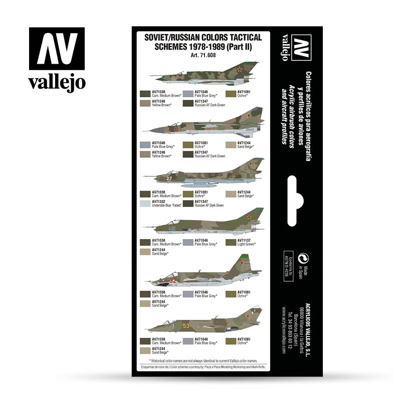 Estuche de colores Model Air desarrollado para pintar diferentes modelos de la Fuerza Aérea Soviética (actual Federación Rusa) durante las últimas décadas de la “Guerra Fría” y posterior caída del Bloque del Este. Incluye perfiles de aviones, donde se indican los colores necesarios para pintar los esquemas de camuflaje y una descripción detallada de los mismos.