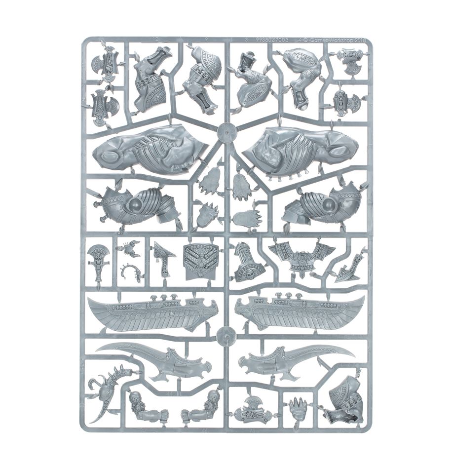 Este kit también incluye un Rey Funerario, que se puede montar a pie con una peana independiente. Alternativamente, puedes montar una Esfinge de Guerra Khemriana, una construcción guardiana que porta un war-howdah en combate.